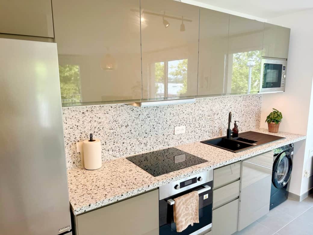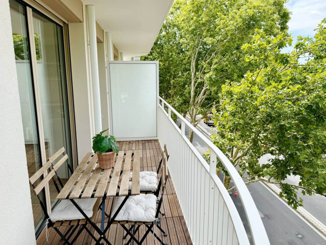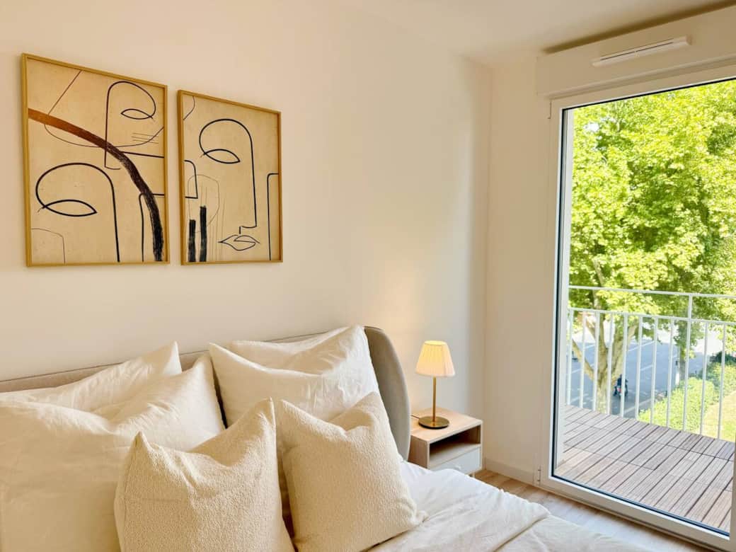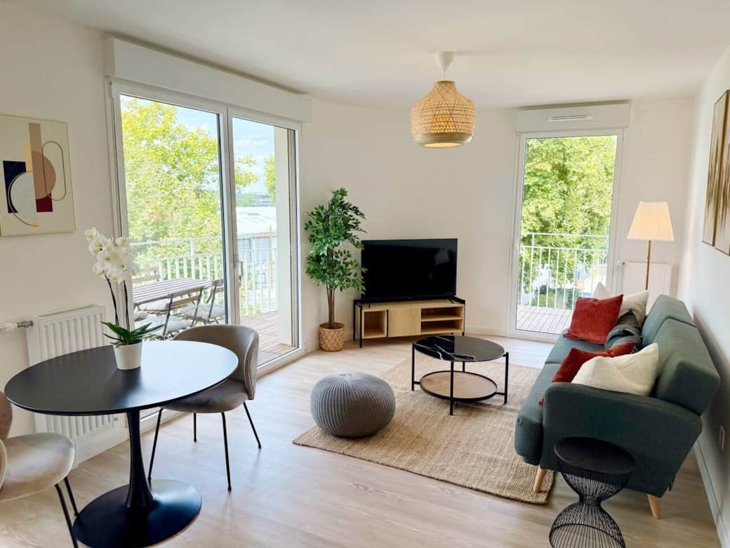 Welcome to your brand‑new retreat in Villeneuve‑la‑Garenne. The apartment is filled with natural light from large windows opening onto a spacious balcony, perfect for morning coffee or an alfresco dinner. The cosy living room includes a sofa that converts to an extra bed and a dining area. The sleek kitchen has induction hob, oven, fridge, dishwasher, Nespresso machine and full cookware. The separate bedroom features a queen‑size bed with quality linens and storage. The modern bathroom offers a walk‑in shower, fluffy towels and a hair‑dryer. Fast fibre Wi‑Fi, smart TV and a washing machine complete the amenities. The building is recent, secure and has a lift.
